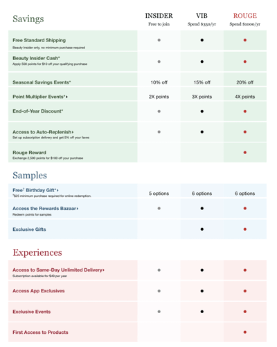 Finally, at tier 3 (termed 'ROUGE' and spending $100/year' customers unlock access to an additional 'Rouge Reward' - an opportunity to exchange 2,500 points for $100 off a purchase. In addition, members that reach this tier are the first to get their hands on the newest releases - before anyone else.